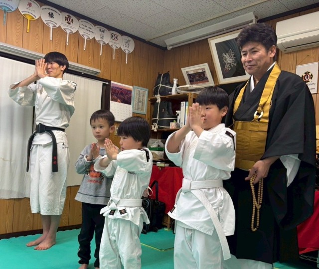 9月度入門式に出席予定でしたが、残念ながら欠席だったハルマ拳士、10月度入門のアヤト拳士、1月度入門のキヨシ拳士と、樹徳高校支部長の藤井先生です。
